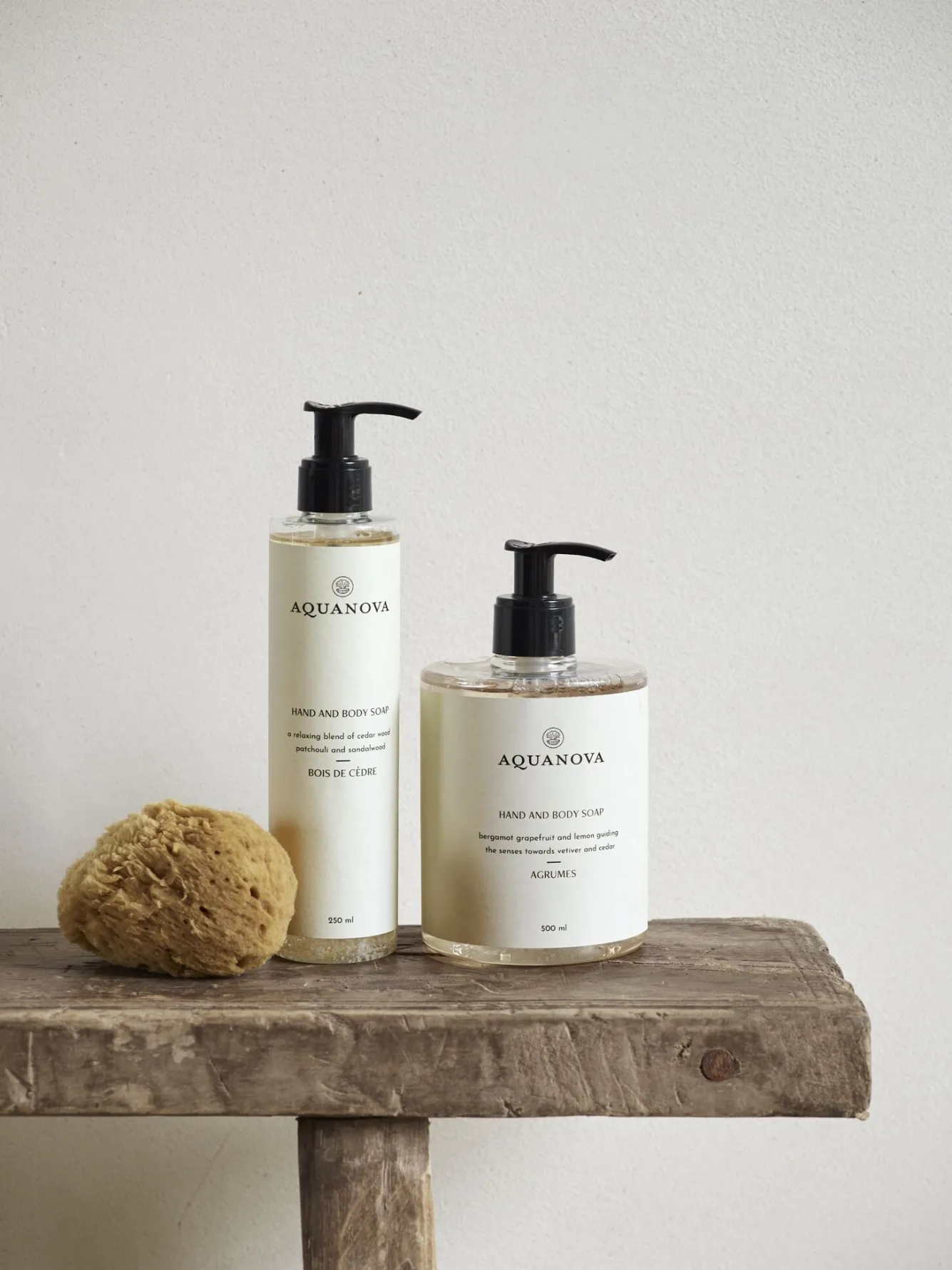 Aquanova Paris Marseille soap Agrumes (PARLDS-AGR)Mild Marseille soap for hand and body from the Paris series by Aquanova with wonderful scents that are not too overwhelming. The soap is made with caring oils (olive and coconut) and glycerine for exceptional softness. The soaps are suitable for all skin types and they are 100 % vegan.The 250 ml liquid soap comes in a refillable PET bottle with pump. The narrow bottle has a diameter of 4.5 cm and is 20 cm high.Fragrance AgrumesThe Aquanova fragrance Agrumes is a subtle citrus scent. Bergamot, grapefruit and lemon lead the senses to vetiver and cedar.
