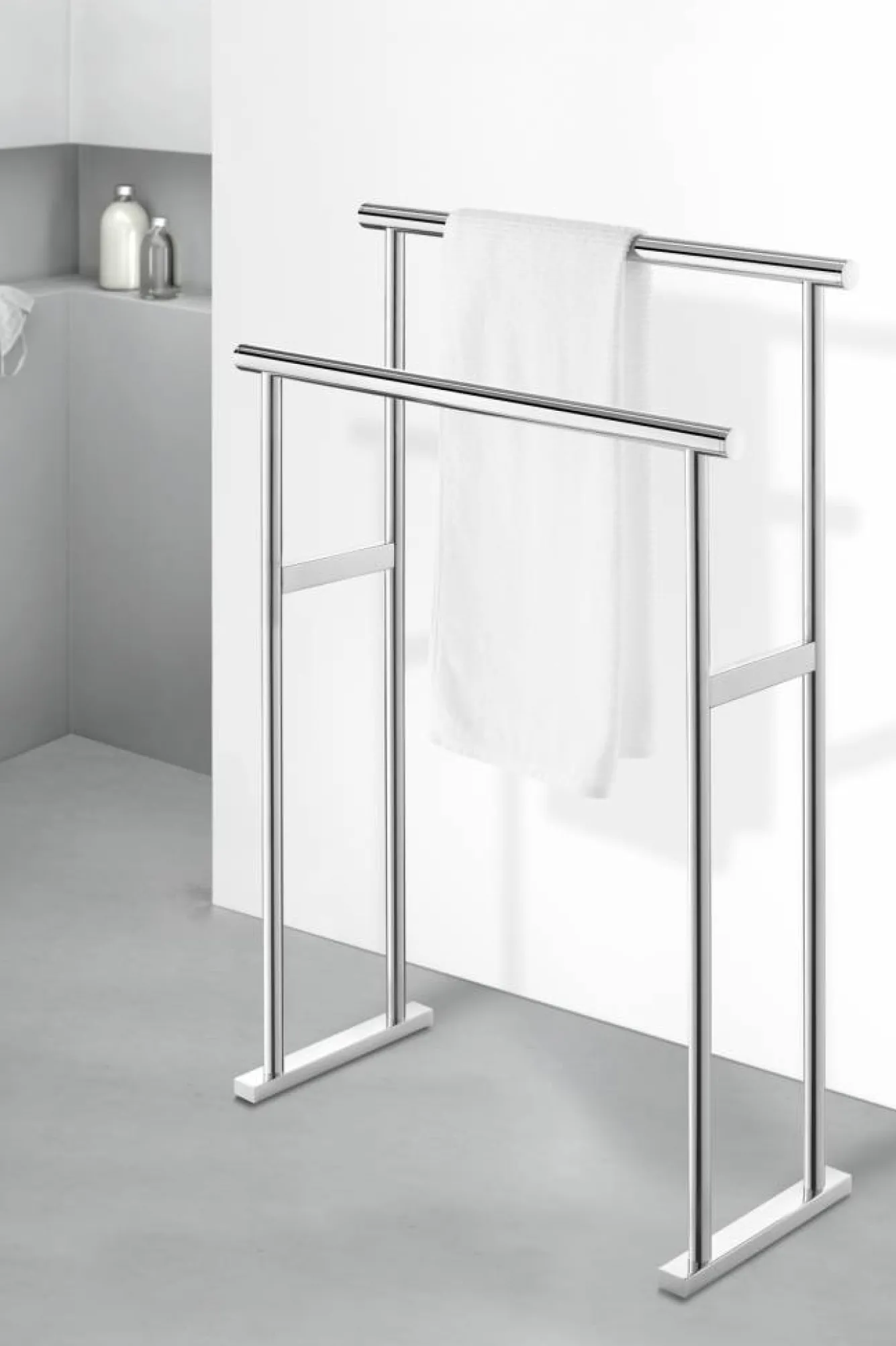 Can be found in bathrooms for many years: stainless steel bathroom and toilet accessories with the traditional shine. The items in this series have round shapes with a smooth finish.Product informationTowel rackArticle no. 40087DimensionsHeight: 80 cmWidth: 60 cmDepth: 22 cmMaterial informationPolished stainless steel (gloss)CleaningWe recommend using only water with a little washing-up liquid to clean the Zack items.