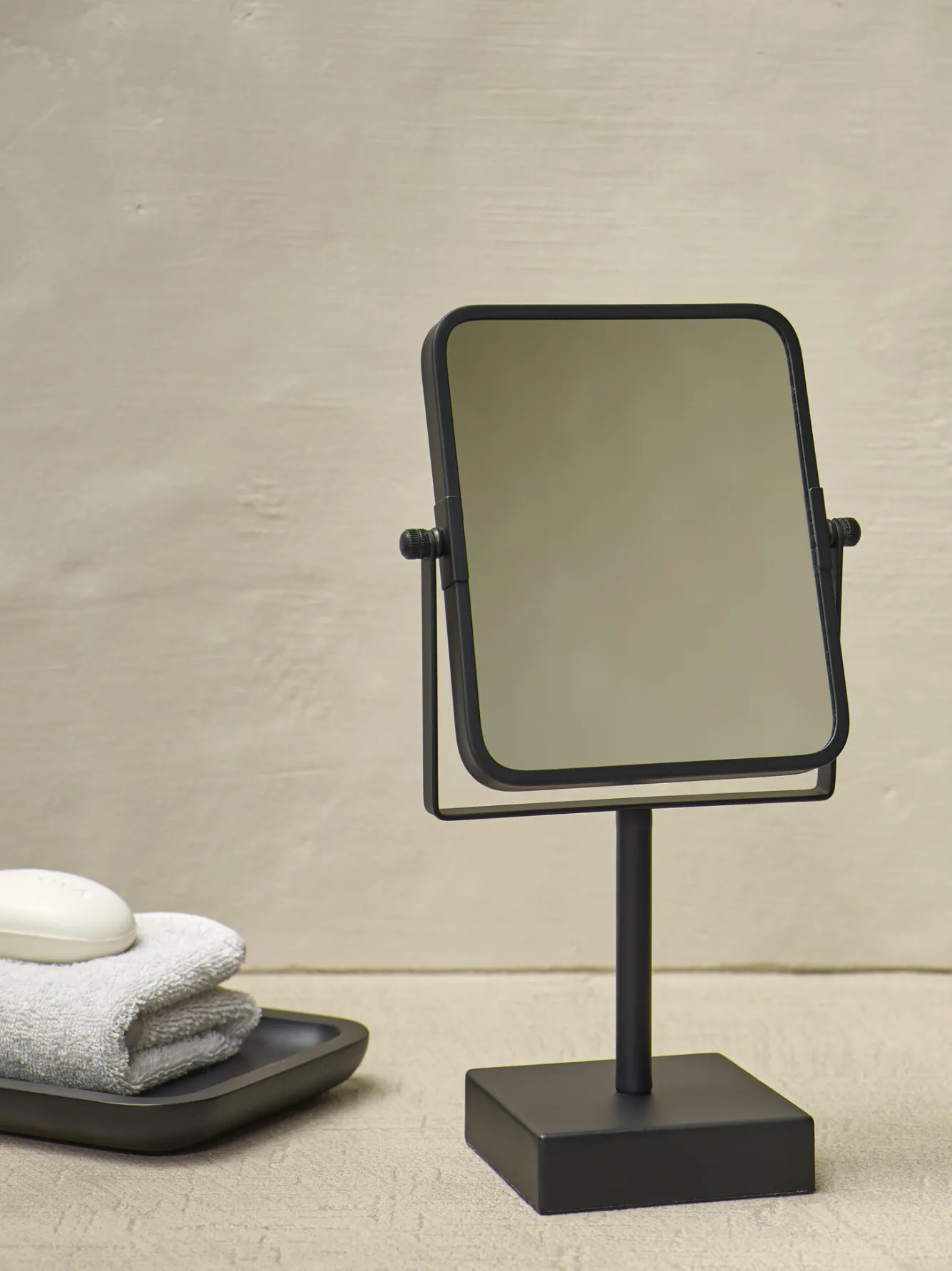 This Dax cosmetic mirror from Aquanova is made of metal with a black powder coating. It is a standing model and has a base with straight shapes. The mirror itself is double-sided and rotatable, with a 3x magnification on one side. This makes the mirror also very suitable as a shaving mirror. There are studs on the bottom of the foot to prevent scratches.Dax cosmetic mirrorItem number: DAXMIR-09ColourBlack-09 (black)DimensionsHeight: 33.2 cmWidth: 16.5 cmDepth: 10 cmMagnification: 3xMaterial information The Dax mirror is made of powder-coated metal.CleaningDo you want to clean the product? Then use warm water with a little soap or dishwashing liquid.