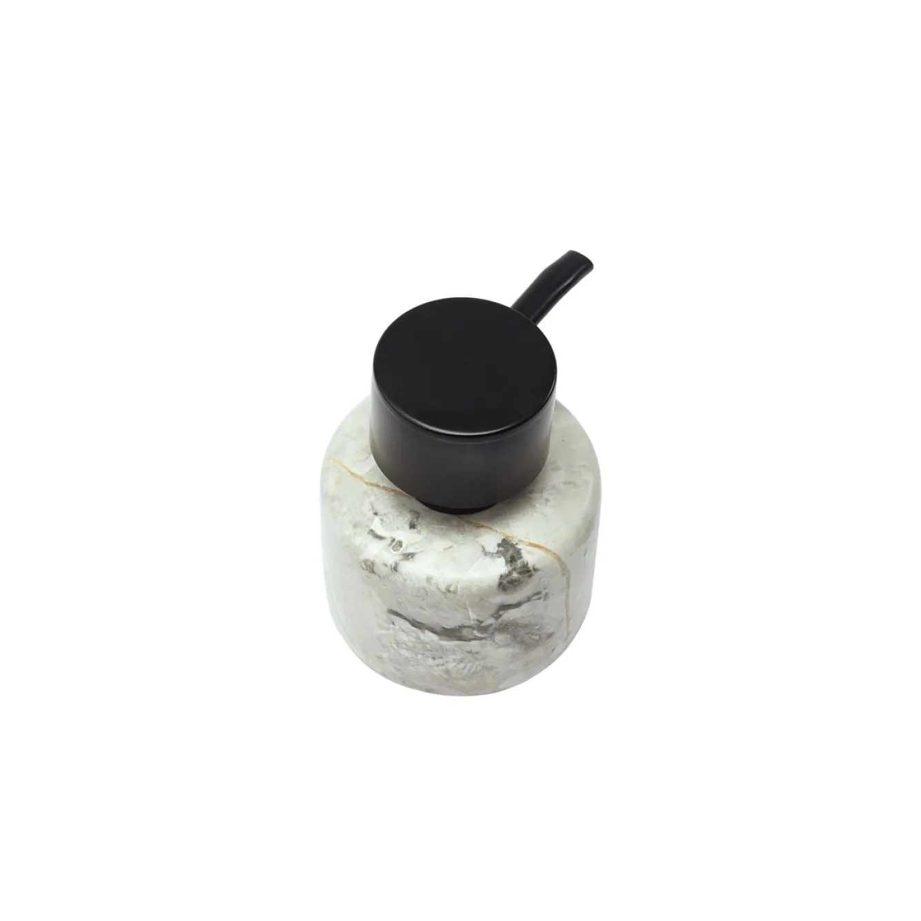 The soap dispenser from the Nero series from Aquanova is handmade and has a luxurious appearance. This is due to the natural stone with chic marbling. The pump head is made of steel with a black powder coating. Nero soap dispenser / soap pump (small)Item number: NERDIS-195ColourAlba-195 (gray)DimensionsDiameter: 8cmHeight: 10 cmContents: 30 mlMaterialNatural stoneBlack powder coated steel (pump head)The color and pattern of the items may differ per delivery depending on the quarry and stone structure.MaintenanceDo you want to clean the product? Then use soapy water and dishwashing liquid. We also recommend using PH-neutral hand soap in the soap dispenser.