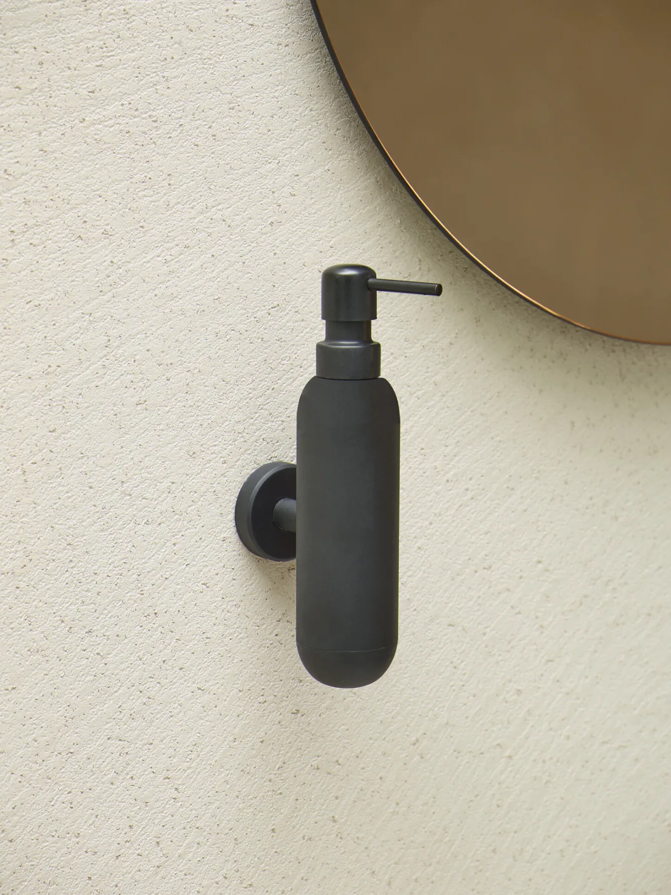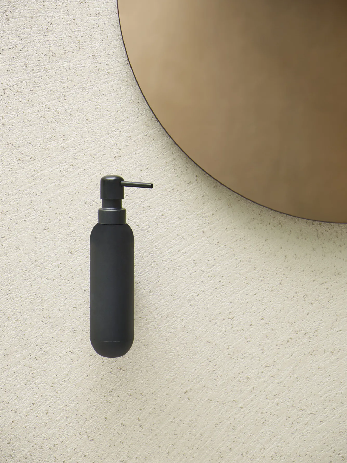 The soap dispenser from the Sten series from Aquanova is intended for wall mounting. The soap pump has a slim shape and rounded shapes. The matte black powder coating finish gives the soap pump a sleek look. Sten soap dispenser for wall mountingItem number: STEDIW-09ColourBlack-09 (black)DimensionsHeight: 20.5 cmDiameter: 5cmDepth: 9 cmConfirmationScrews (included)Material information The Sten soap sispenser is made of powder-coated metal and plastic interior.CleaningDo you want to clean the product? Then use warm water with a little soap or dishwashing liquid.