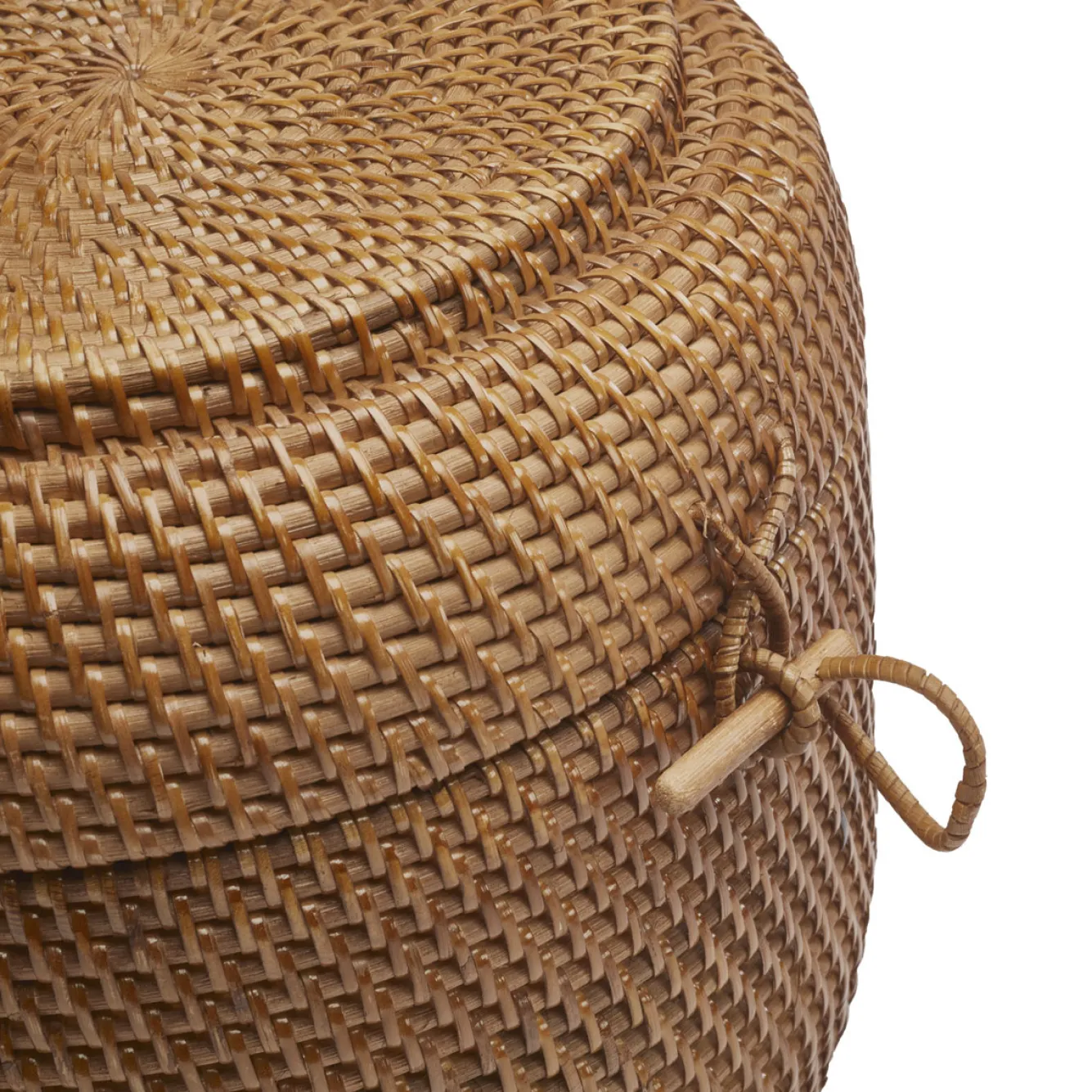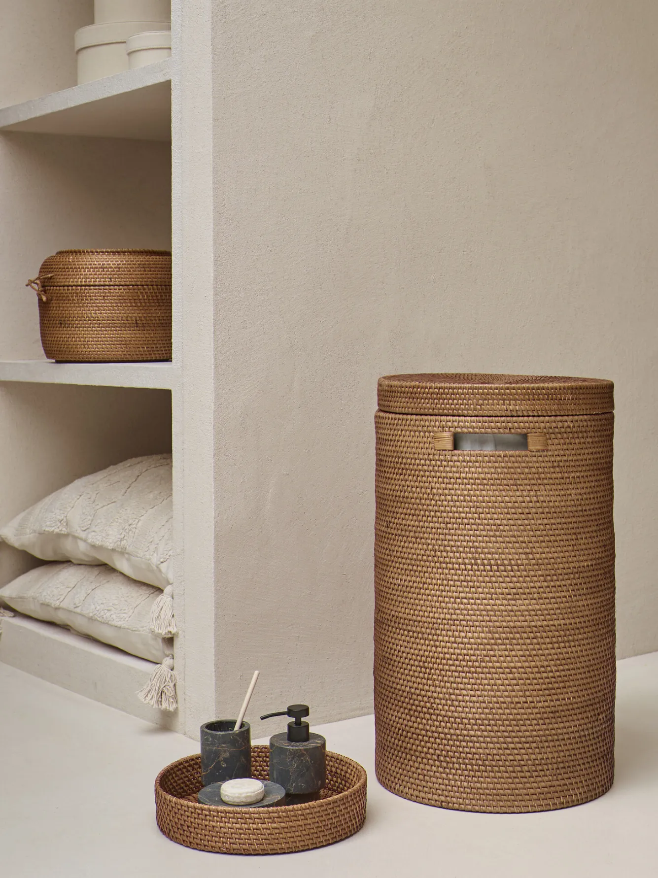 The Cino baskets from Aquanova are stylish baskets, handmade from woven rattan. The laundry baskets and storage baskets can be nicely combined with each other. This way you keep your house nice and tidy! This storage basket has a canvas inner lining and lid with closure. Cino storage basket with lidItem number: CINSBM-299ColourGinger-299 (brown)DimensionsDiameter: 33.5 cmHeight: 21 cmContents: 8 litresMaterialThe Cino baskets are made of 100% Rattan with canvas lining.