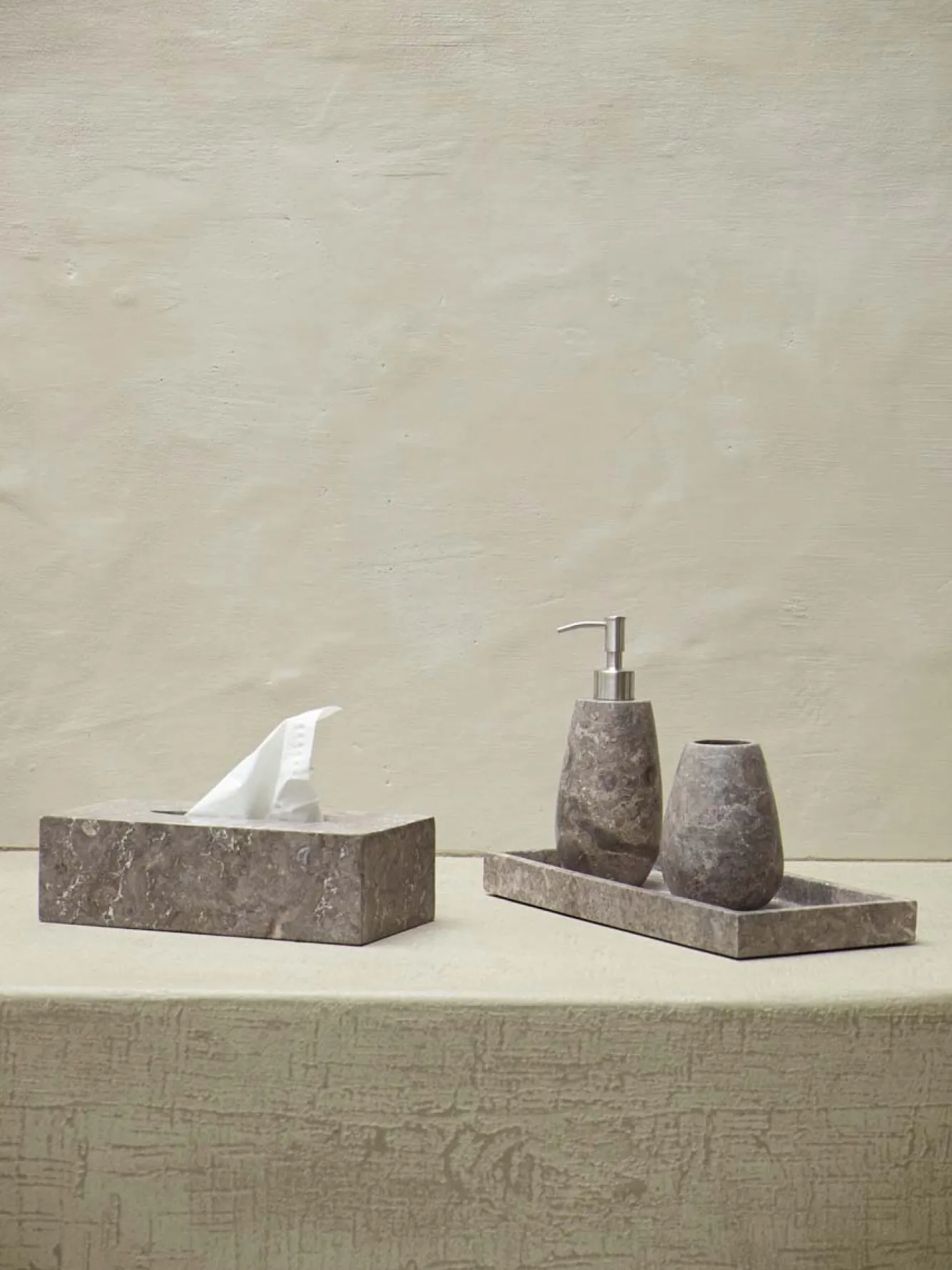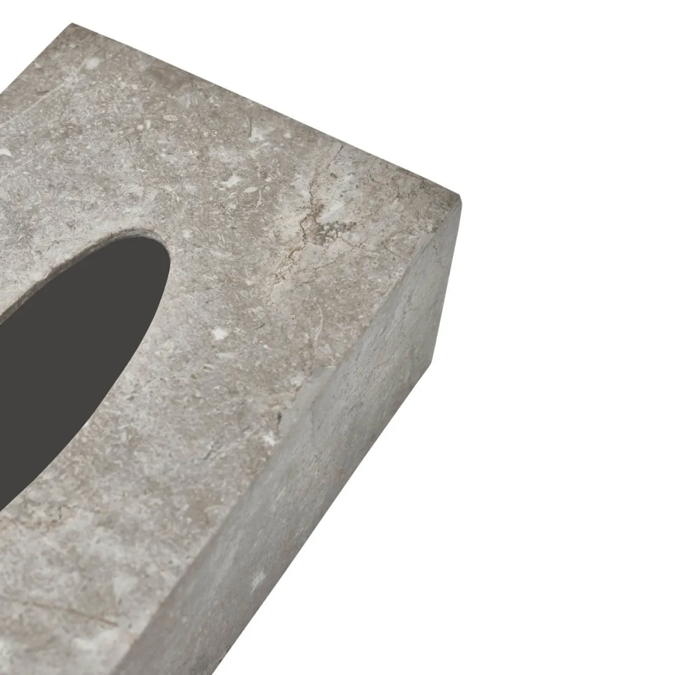 This extensive series of bathroom accessories is made of natural stone in a gray / beige color. This creates a calm, neutral and natural atmosphere in your bathroom or toilet. Nice to combine with wood or other natural materials. Tissue box holderArticle number: CONTIL-15ColourGreige-15 (gray/beige)DimensionsWidth: 25.5 cmDepth: 13 cmHeight: 7.5 cmMaterial informationThe Conor accessories are made of natural stone.Please note: this is a natural product. The color and pattern of this product may vary from delivery to delivery depending on the quarry and stone structure.MaintenanceDo you want to clean the product? Then use soapy water and dishwashing liquid.