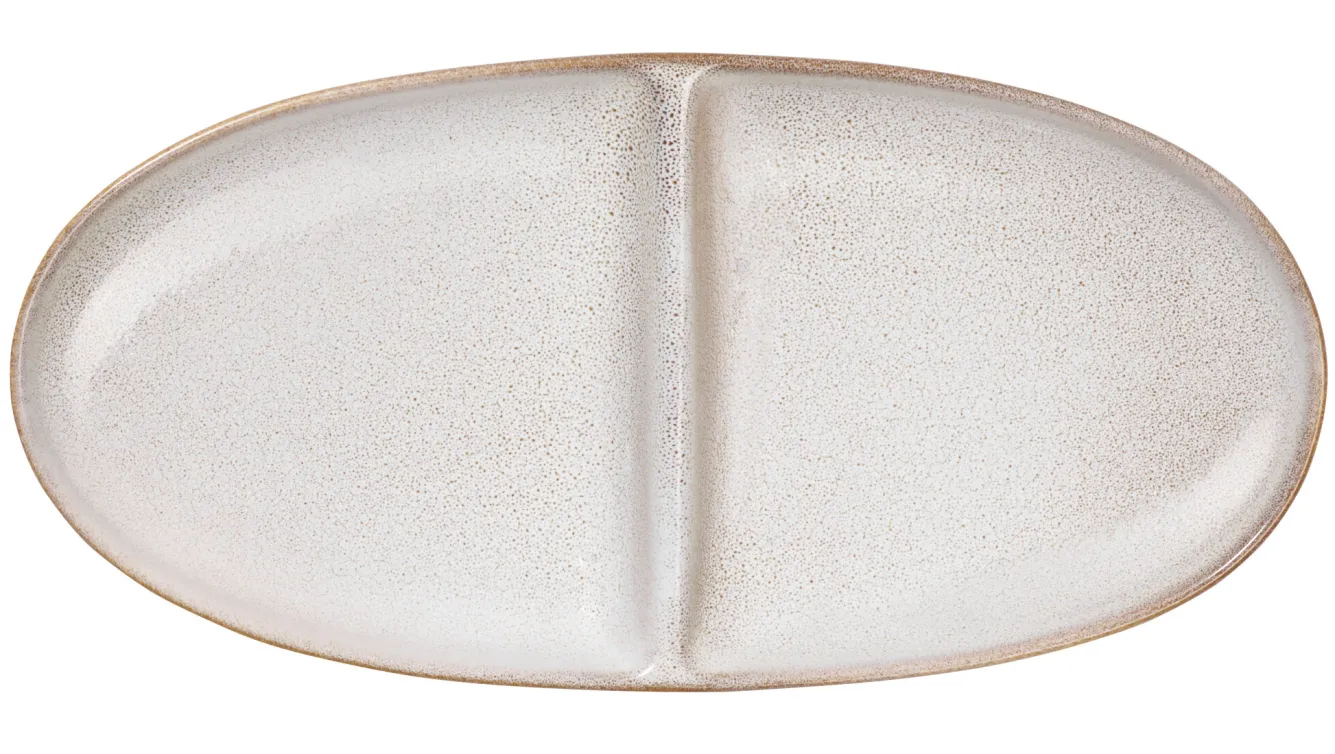 Serving bowl with compartments from the Saisons series from ASA. A stoneware tableware series that is handmade in Portugal by a small family business. The different Saisons colors are a representation of the Portuguese coast; sea, sky and beach. The sand is not always fine and the sea and sky are not always blue. This free character is reflected in the effect glaze of the Saisons tableware. The series is very extensive with items in various shapes and sizes. The different colors create even more possibilities for combinations. Serving bowl oval (two-piece)Item number: 27122ColourSand-107 (beige)DimensionsLength: 20cmWidth: 10 cmHeight: 2 cmThe dimensions of the Saisons tableware may vary slightly due to the organic shapes.Material informationThe Saisons tableware is made of speckled stoneware and finished with a glossy reactive glaze.Suitable for dishwasher, microwave and oven.Maintenance adviceEven though the tableware is dishwasher safe, dishwasher detergents can lead to a dull appearance of the items. To prevent this, we recommend washing the dishes by hand.