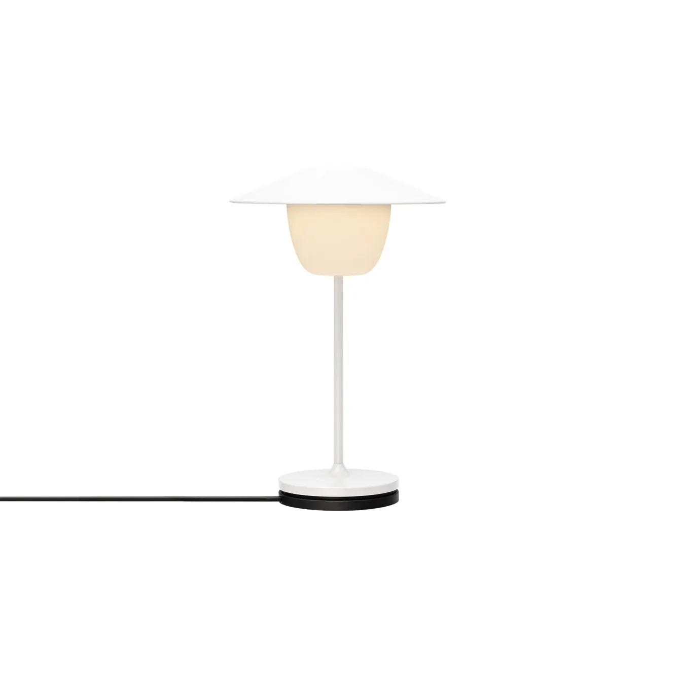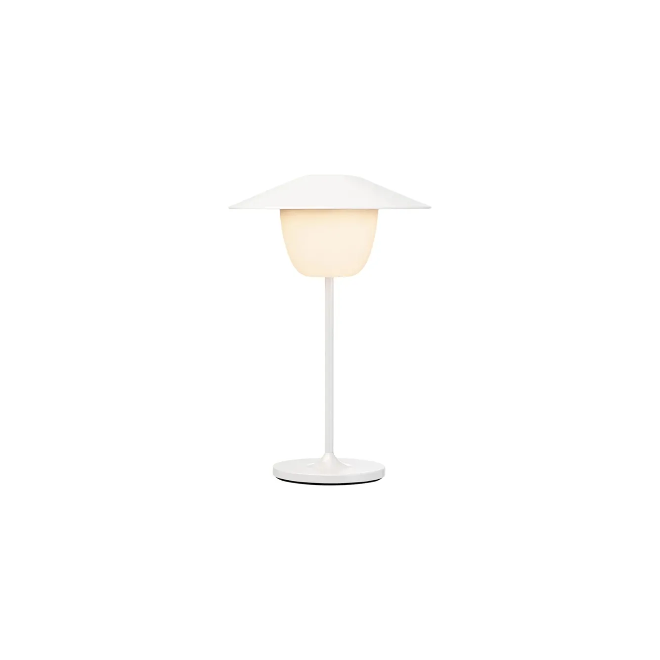 The mini lamp from the Ani series from Blomus provides surprising light! Due to the compact size and the integrated battery, the table lamp is easy to move, both in the house and outside on the covered terrace. The rechargeable LED lamp has 3 light settings and a dimming function and can also be used while charging. Easy to operate with the touch function in the middle of the lampshade. Ani mobile table lamp mini (LED)Item number: 67073ColourWhiteDimensionsDiameter: 14.5 cmHeight: 21.5 cmMaterial informationThis Ani lamp is equipped with a light cone with LED lamp (resistant to splash water).The stand and lampshade are made of matte powder-coated aluminum.CharacteristicsBurning time: 7 – 35 hoursLuminous flux: 80 lmPower: 1 WVoltage: DC 3.7VProtection class: IP 54Light color: 2700-4000KCharging time: 2.5 hoursaccessoriesThe charging station is included in delivery.