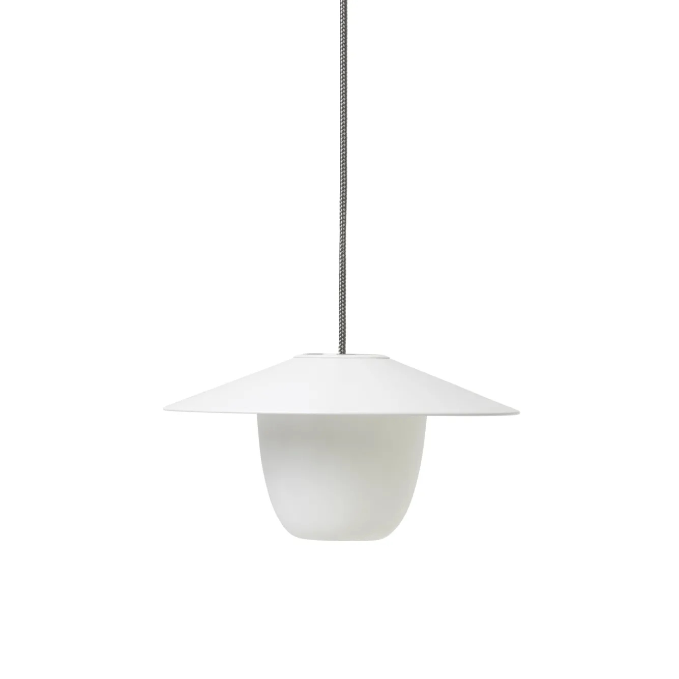 The table lamp from the Ani series from Blomus is multifunctional! The rechargeable LED lamp can be placed on the stand, hanging on the rope or turned over as a scale model on the table. The integrated battery makes the light easy to move, both in the house and outside on the covered terrace. By briefly touching the rings on the lampshade you can easily switch between on, off and 2 light modes. Ani mobile table lamp small (LED)Item number: 65928ColourWhiteDimensionsDiameter: 22 cmHeight: 33.5 cmMaterial informationThis Ani lamp is equipped with a light cone with LED lamp (resistant to splash water).The stand and lampshade are made of matte powder-coated aluminum.CharacteristicsBurning time: 8 – 16 hoursLuminous flux: 100 lmPower: 0.6WVoltage: DC 3.7VProtection class: IP 44Light color: 3000KCharging time: 2 hoursExpected lifespan: approximately 20,000 burning hoursaccessoriesStand, charger, USB cable and rope are included.