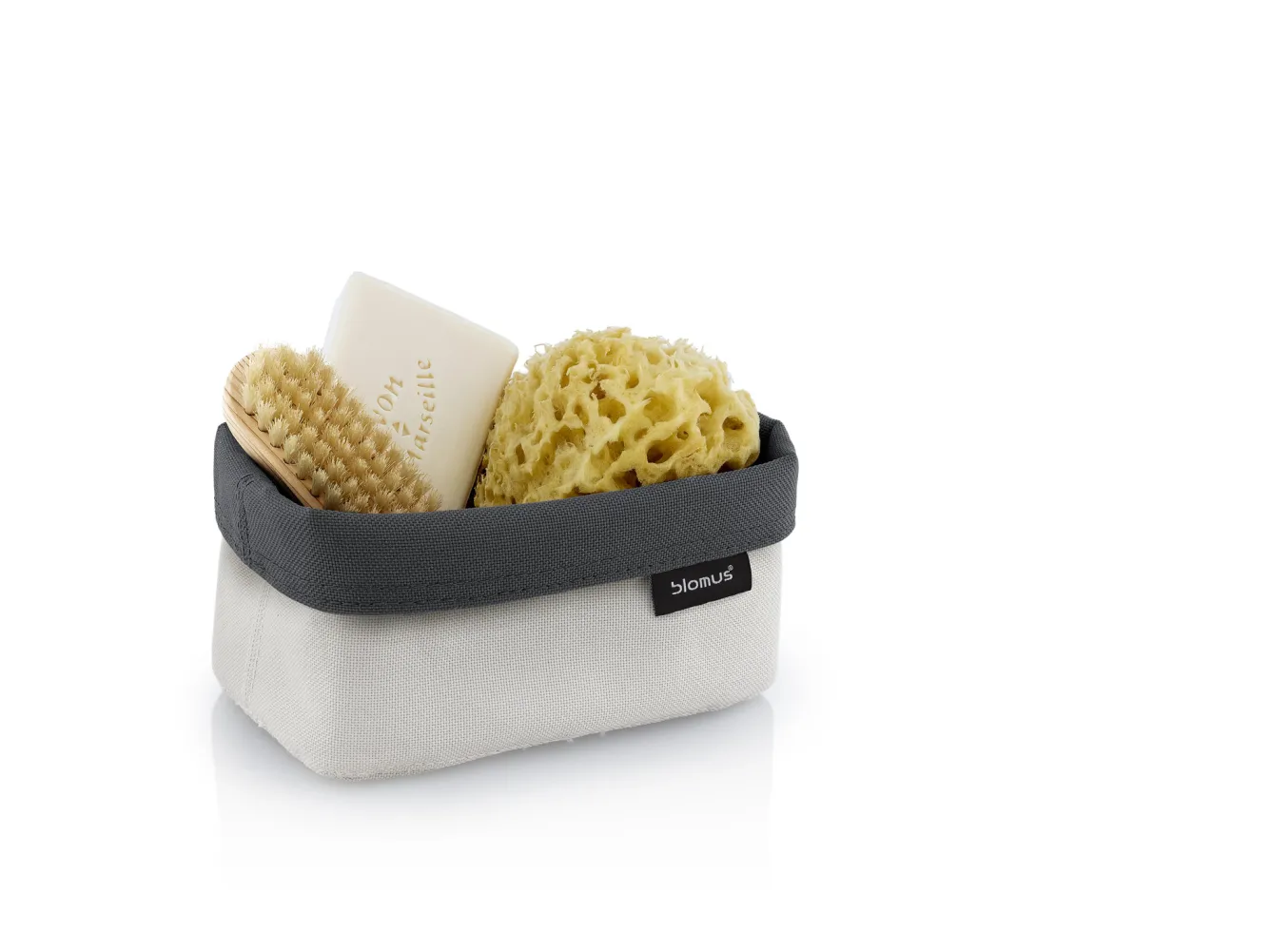 Bathroom accessories ARAStorage basketItem no. 68894Tetron 65% Polyester and 35% ViscoseColor AnthraciteHeight: 7 cmLength 14 cmWidth 9 cmCan be used on both sides. (inside has a light sand color)