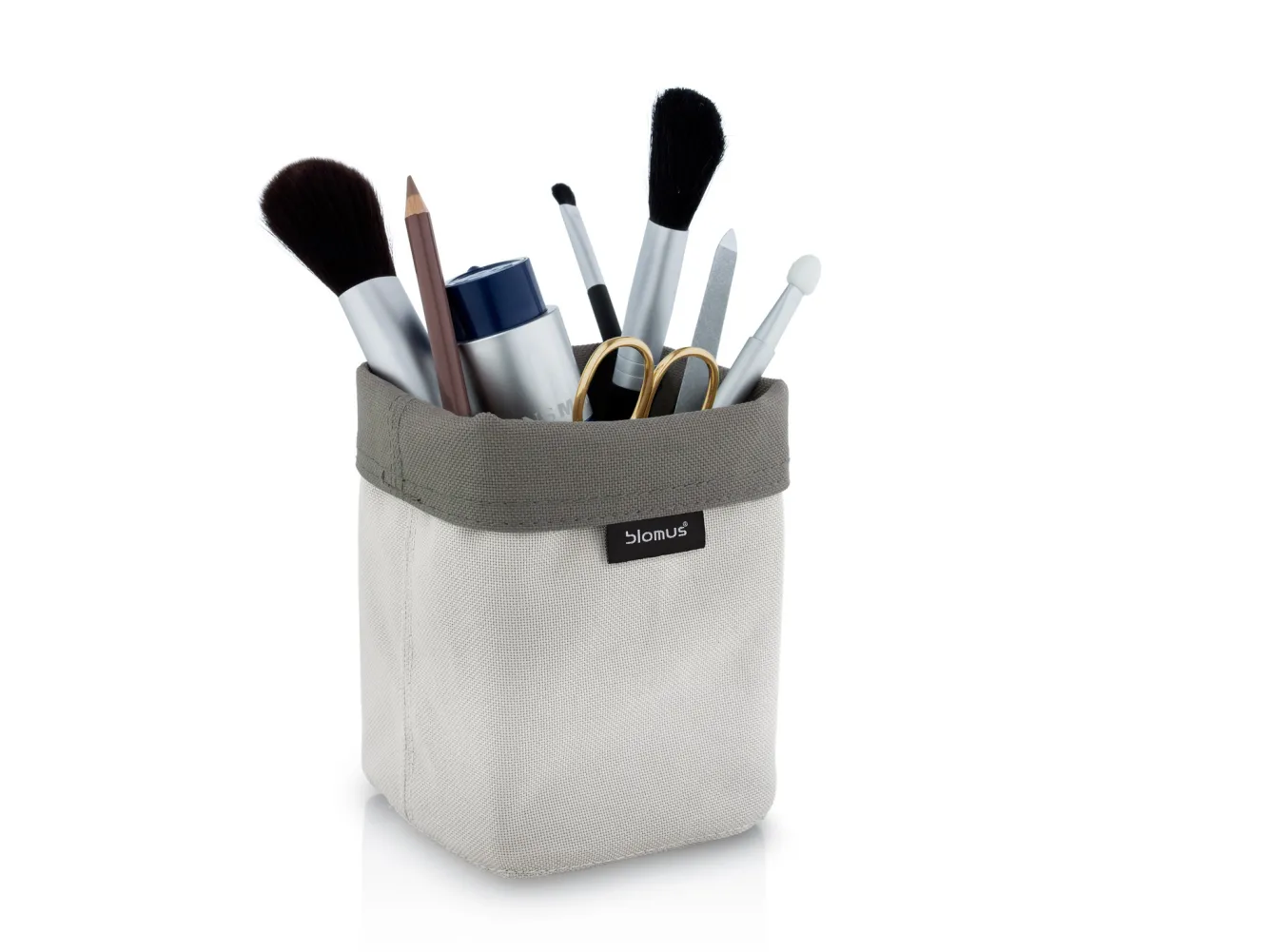 Bathroom accessories ARAStorage basketItem no. 68896Tetron 65% Polyester and 35% ViscoseColor TaupeHeight: 12cmLength 11cmWidth 11 cmCan be used on both sides. (inside has a light sand color)