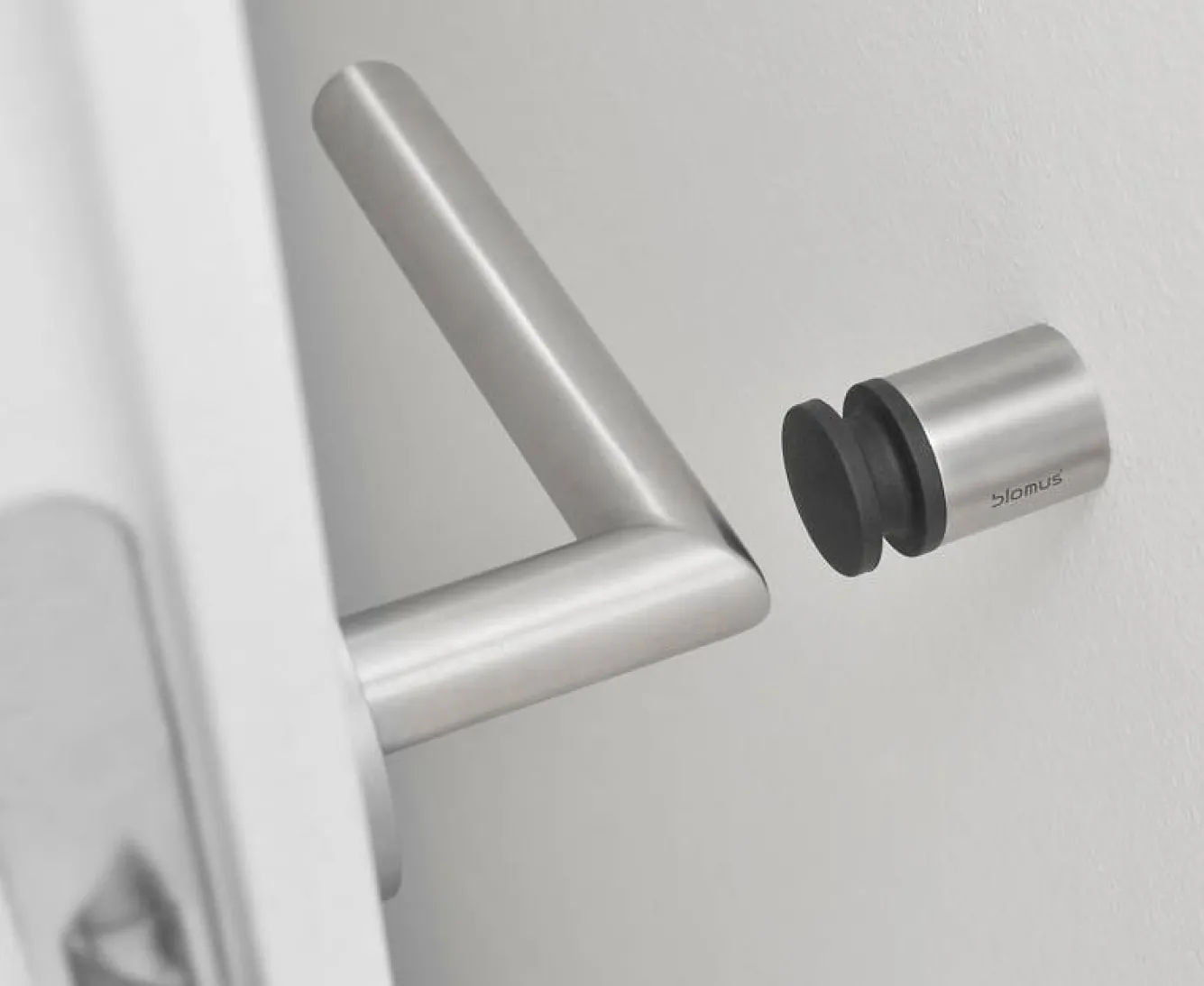 This Blomus door stop is easy to use because it can be attached to the wall. The soft silicone rubber stops the door gently. Made of brushed steel.Door stopper EntraItem number: 66713ColourAnthraciteMaterial informationBrushed stainless steel (matt)Soft plastic tip (black)DimensionsLength: 4cmDiameter: 2.5cmConfirmationScrews (included)