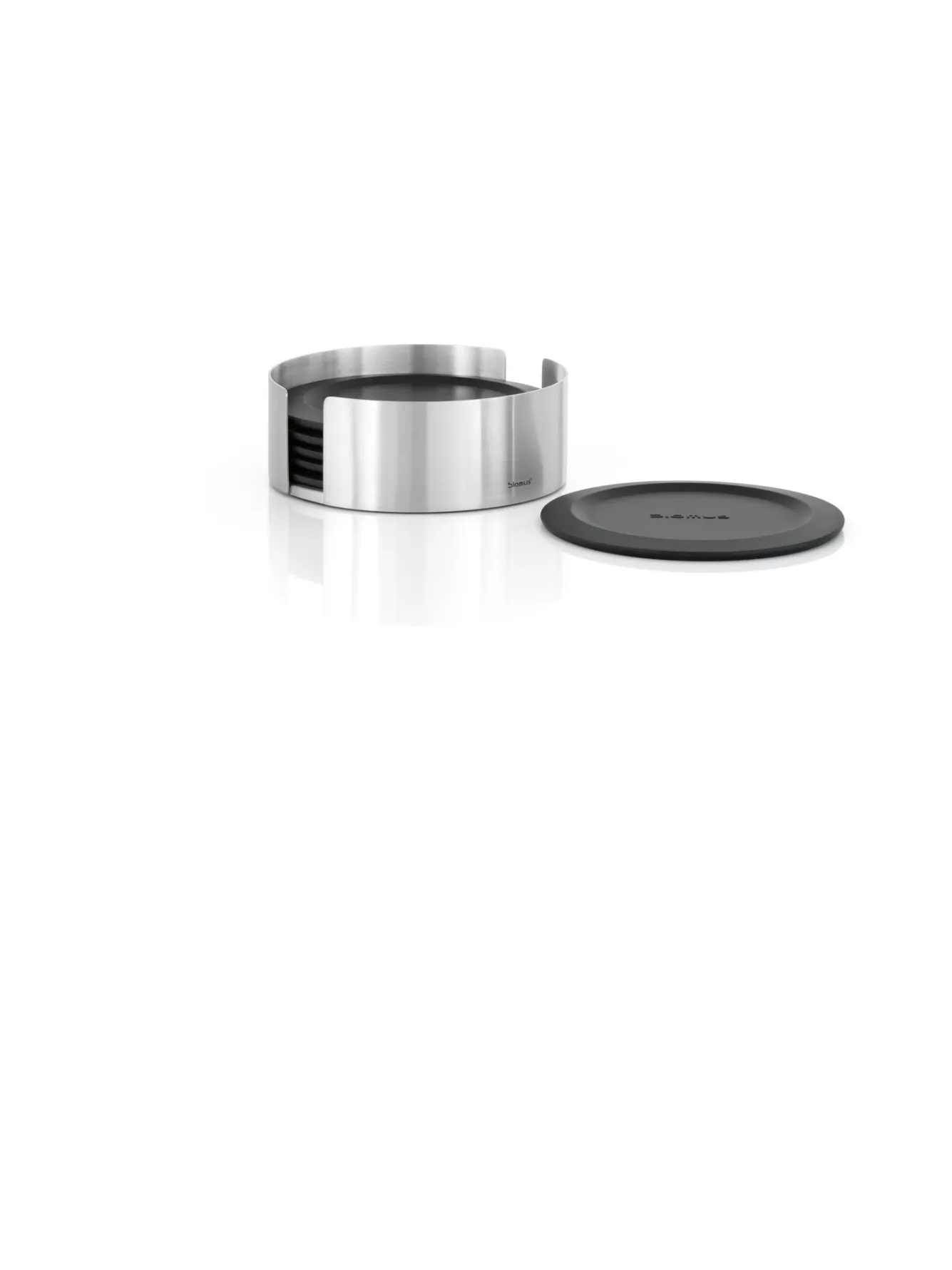 CoastersItem no. 64063Product informationHolder including 6 coastersColor SharkskinMaterialHolder: brushed stainless steel (mat)Coasters: siliconeDimensionsHeight: 4 cmDiameter: 11.5 cm