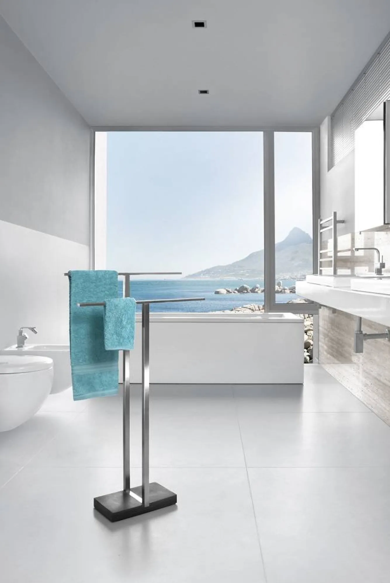 Bathroom accessories MENOTOTowel rackArticle no. 68624Brushed stainless steel (mat)Polystone base (27x16cm)Height: 86cmWidth: 50cmDepth: 16cm
