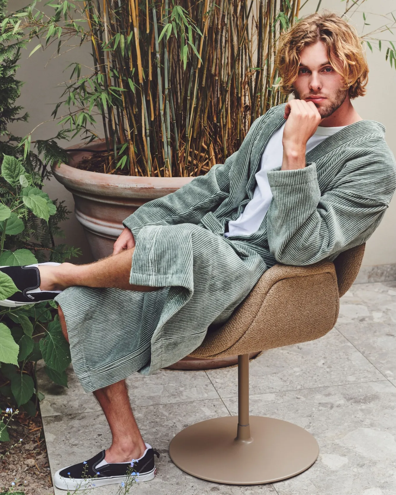 With its length down to the calf and the beautiful stripe pattern, the Antonio bathrobe is a wonderful bathrobe to walk around in for hours. A nice roomy fit, 100% velor cotton and a comfortable kimono collar ensure optimal wearing comfort for men and women. Bathrobe AntonioArticle number BAEG22201ColourOlive-113 (green striped)Quality 100% velvet cotton360 gr/m²Characteristics- Kimono collar- Belt- Straight sleeves- Deep pockets- Length up to the calfSize advice:This bathrobe is available in sizes S, M, L, XL and XXL and corresponds to the ready-to-wear sizes.Washing instructions:Machine washable at 60 degreesDry on a light setting