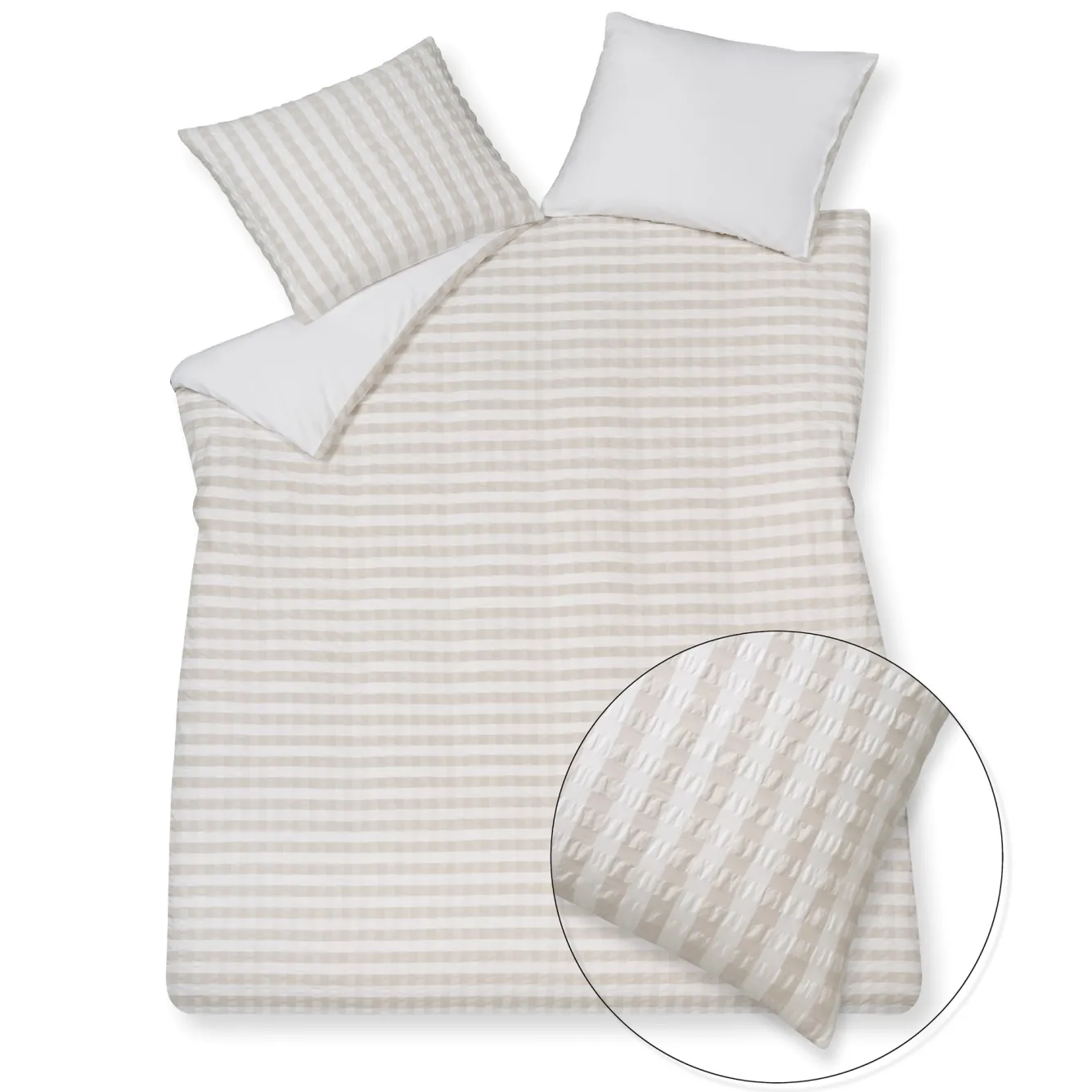 The Pure 81 duvet cover (PRSA24181) has a decorative seersucker cotton weave for a stylish and voluminous look. The woven pattern is crossed by yarn dyed beige stripes on a white background. The underside of the cover and pillowcase is smooth woven percale cotton. 1-person duvet cover Pure 81 (including 1 pillowcase)Item number PRSA24181Mate Duvet cover: 140 x 220 cmPillowcase: 60 x 70 cmQualityTop: 100% cotton, seersucker weaveUnderside: 100% plain percale cottonColour Multicolor-000Tuck-in stripYes (large bottle neck)Washing instructions Machine washable at 40-60 degreesDry at low temperatureIron on setting 3