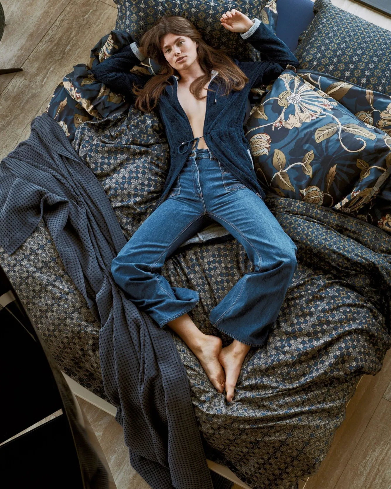 The dark blue duvet cover Sky Night (SAM123228) has a design of large tropical flowers and leaves in green colors. The duvet cover is made of 100% satin cotton and is uni dark blue on the bottom.1-person duvet cover Sky Night (including 1 pillowcase)Item number SAM123228Mate Duvet cover: 140×220 cmPillowcase: 60×70 cmThe pillowcase has a luxurious Oxford decorative border all aroundColour Blue Ink-199 (dark blue)PrintTop: Sky NightUnderside: Uni coloredQuality 100% satin cotton Tuck-in strip The duvet cover has a tuck-in strip of approximately 35 cm (large bottle neck) Washing instructions Machine washable at 40 degrees (dark colors) or 60 degrees (light colors)Dry at low temperatureHot ironing