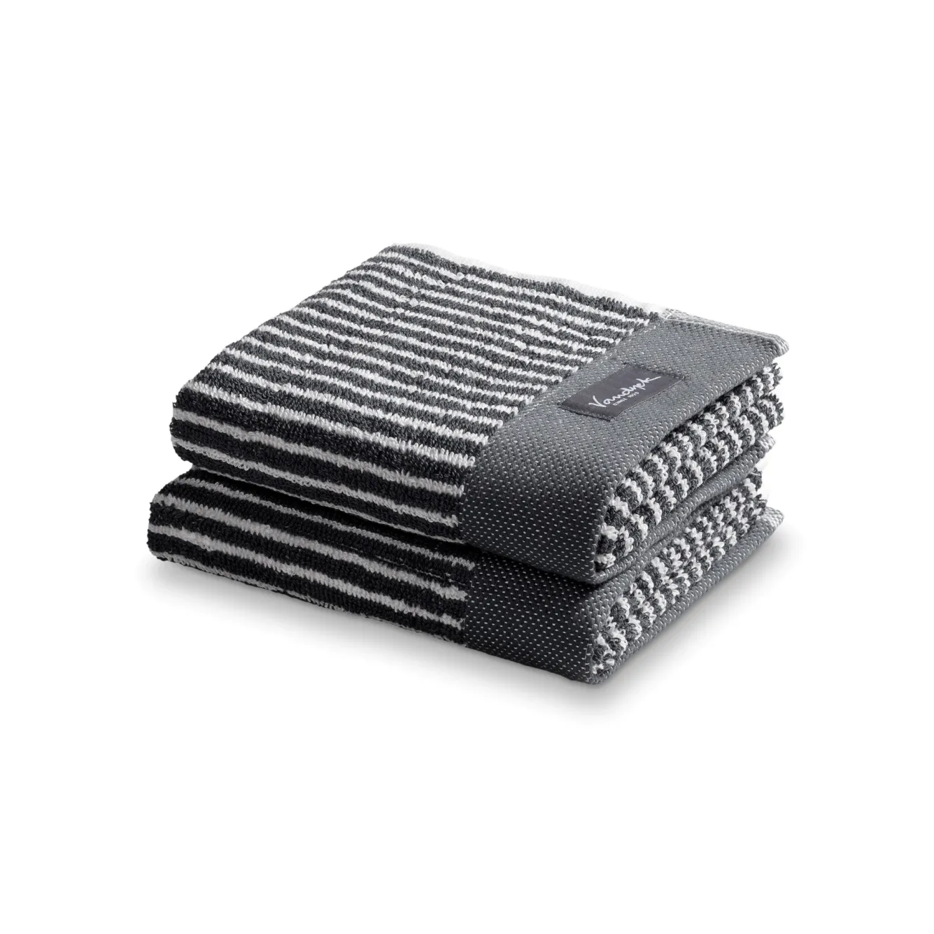 With Vandyck’s HOME bath textiles you choose quality at an excellent price! These Terry woven towels are sturdy, densely woven (550 grams/m²) and have a luxurious, wide finishing edge with a loop on the short side. HOME Petit Ligne guest towel (set/6 pieces)Item number: BAKC15101Mate30x50 cmColourOff Black-198 (striped)Quality 100% cotton550 gr/m²Characteristics- Wide finishing edge- Loop on the short side- Terry woven- Yarn dyed- Striped designWashing instructionsMachine washable at 60 degreesDry on a low setting