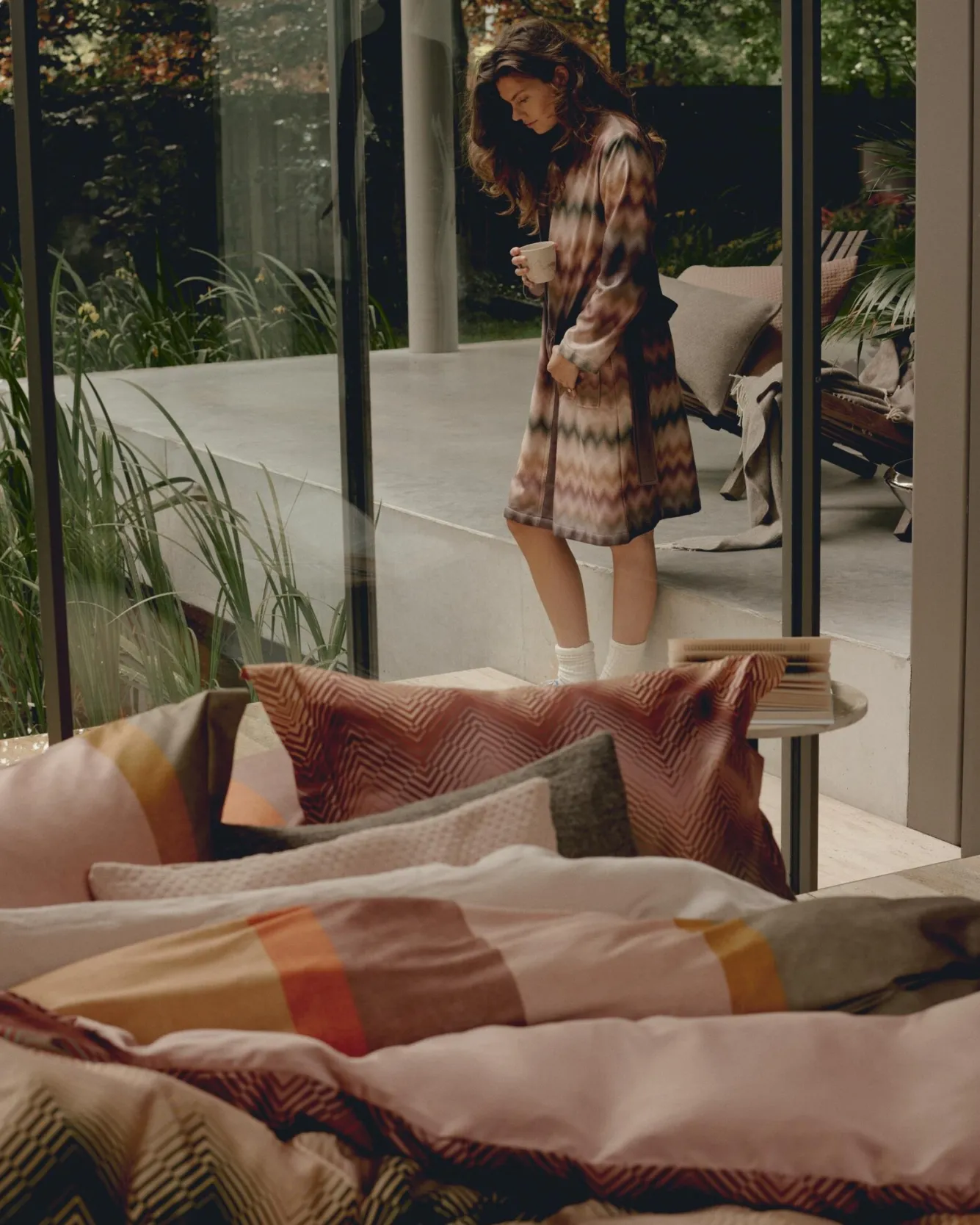 Vandyck 2 person duvet cover Blurred LinesThe 2-person duvet cover Blurred Lines has a zigzag pattern in which the lines seem to constantly shift. The color combination of different shades of brown, soft pink, green and a bit of red is reminiscent of autumn. The solid color on the back is a mix of pink and brown. The duvet cover is made of 100% satin cotton.The Vandyck Blurred Lines double duvet cover of 200 x 220 cm is suitable for a small double bed and comes with 2 pillowcases of 60 x 70 cm. The pillowcases have a luxurious Oxford decorative border. For easy making of your bed, the duvet cover has a spacious bottle neck as a tuck-in strip.Satin cottonThe Satin Printed duvet cover is made of a supple satin cotton. This luxurious variant of cotton is wonderful to sleep under. In addition, satin cotton is often almost iron-free. The weaving technique creates a light sheen and the design and colours come out extra beautifully. This duvet cover has a thread count of 200 TC.Washing instructions The Blurred Lines duvet cover can be washed in the washing machine at 40 degrees. It can be tumble dried at a low temperature and ironed at a high temperature. Don’t feel like ironing? Then it is better to hang the cover out neatly.