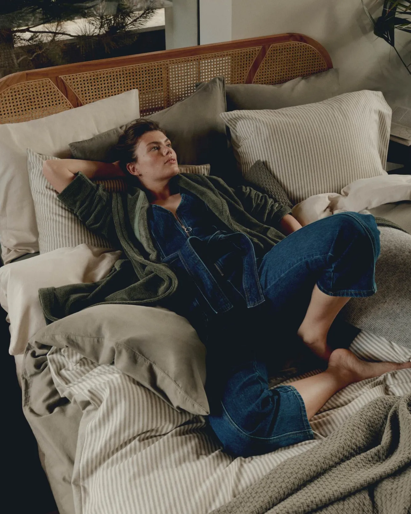 Vandyck Pure 82 bedspread 260×260 cm ThymeGreen, large bedspread from the Vandyck Pure collection, made of 100% cotton. The Pure 82 bedspread is stitched in such a way that a pattern of squares is created. The decorative stitching also gives the fabric a voluminous effect and a luxurious feel and appearance. Due to the large This soft blanket can be used not only as a decorative bedspread, but also to sleep under during warm nights.Color Thyme-304 The Vandyck colour Thyme is a soft green shade with a hint of grey that goes well with natural shades. Are you looking for a contrast? Then a bedspread in Thyme is a nice match with complementary colours such as orange and red shades.Washing instructions The Pure 82 bedspread is machine washable at 40 degrees Celsius with similar colours and can be tumble dried at a low temperature. You can iron the bedspread at medium temperature.