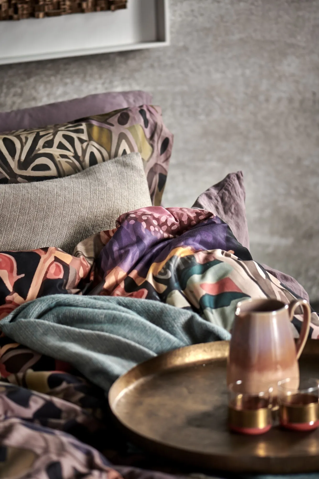Vandyck 2 person duvet cover WildscapeThe 2-person duvet cover Wildscape is reminiscent of an abstract painting of flowers. The different deep shades such as purple and green enhance the brightness of the pink, red and orange colours but also ensure that the design is not too flashy. The plain colour on the back is dark purple. The duvet cover is made of 100% satin cotton.The double Vandyck duvet cover Wildscape of 200 x 220 cm is suitable for a small double and comes with 2 pillowcases of 60 x 70 cm. The pillowcases have a luxurious Oxford decorative border. For easy making of your bed, the duvet cover has a spacious bottle neck as a tuck-in strip.Satin cottonThe Satin Printed duvet cover is made of a supple satin cotton. This luxurious variant of cotton is wonderful to sleep under. In addition, satin cotton is often almost iron-free. The weaving technique creates a light sheen and the design and colours come out extra beautifully. This duvet cover has a thread count of 200 TC.Washing instructions The Wildscape duvet cover is machine washable at 40 degrees. It can be tumble dried at a low temperature and ironed at a high temperature. Don’t feel like ironing? Then it’s better to hang the cover out neatly.