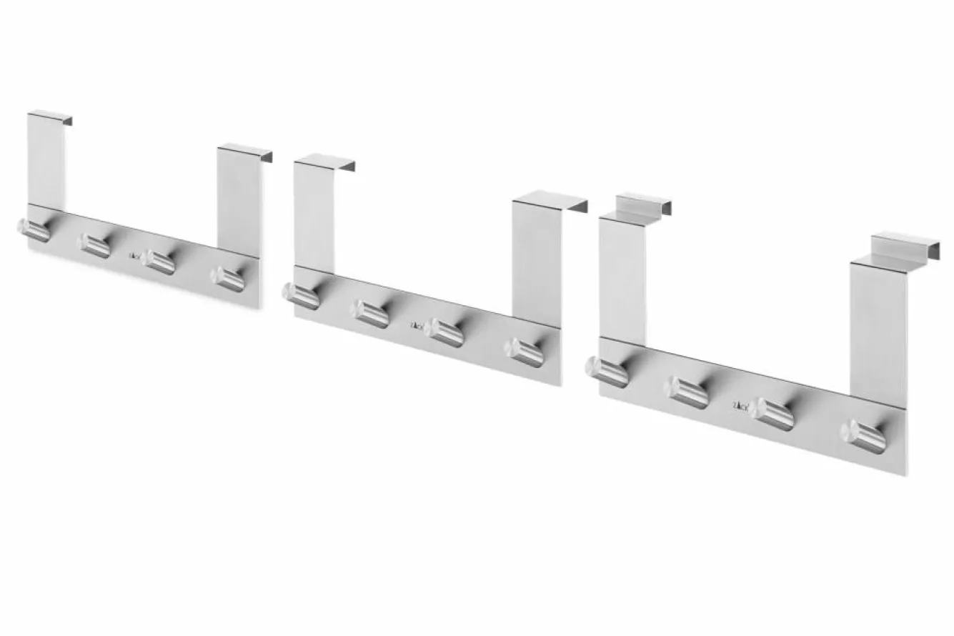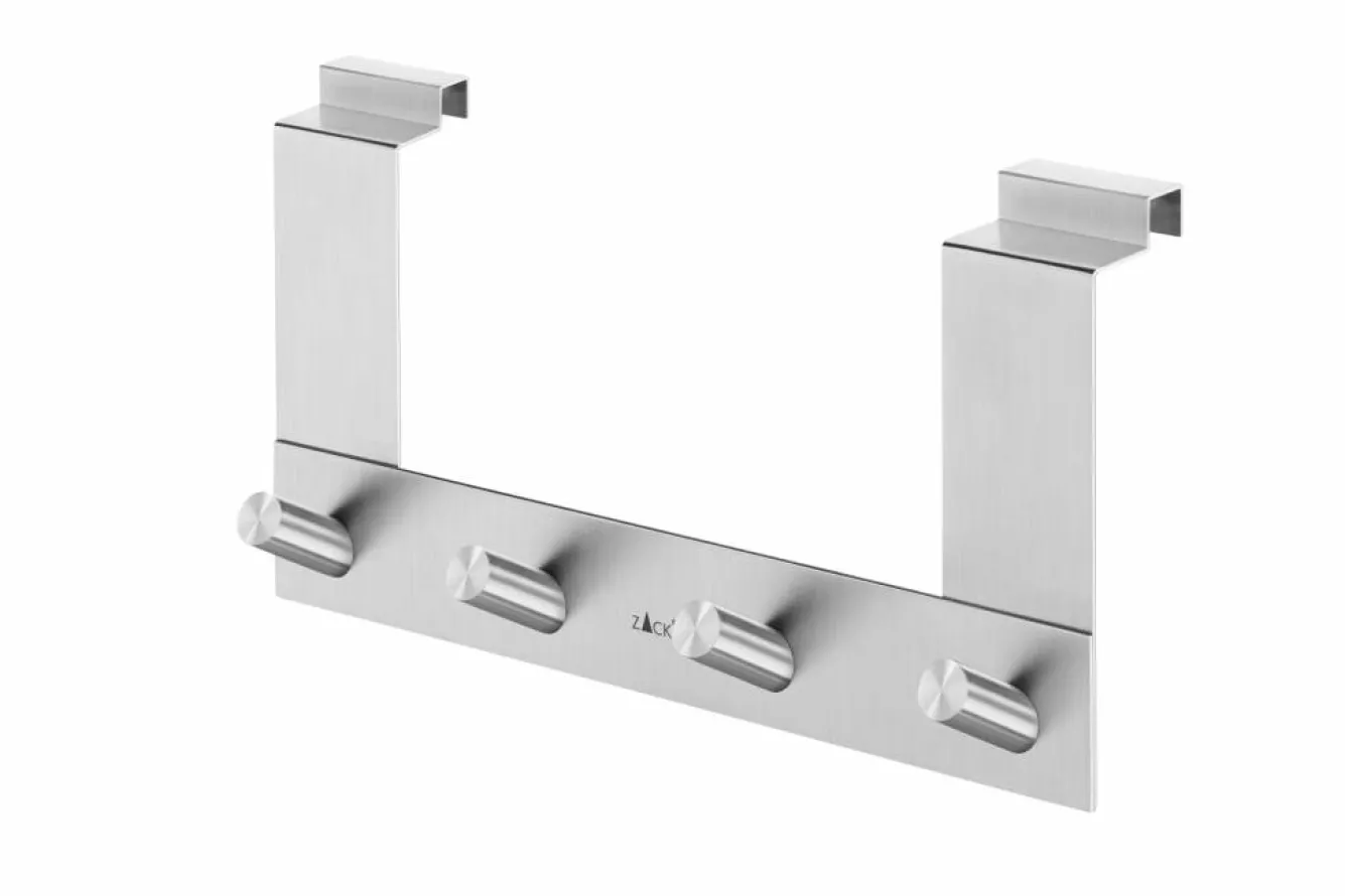 The Zack EXIT door hook is easy to install without drilling or sticking. Simply hang the hook over the door edge. Finished!Product information4-Hook for rebated doorArticle no. 20672DimensionsWidth: 27 cmHeight: 13.5 cmMaterial informationBrushed stainless steel (mat)CleaningWe recommend that you only use water with a little washing-up liquid to clean the ZACK articles.* Thickness front low piece 26 mm* Thickness rear high piece 16 mm* Fully equipped with a soft foam at the back