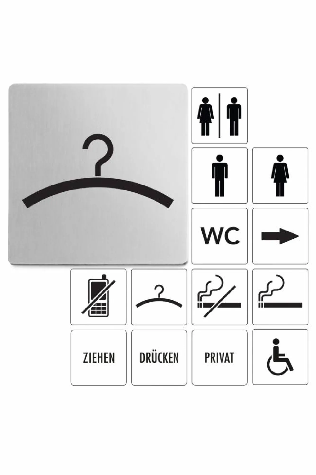 Product informationAdhesive wardrobe iconArticle no. 50718DimensionsWidth: 8 cmLength: 8 cmMaterial informationBrushed stainless steel (mat)ConfirmationSelf-adhesive back (make sure that the surface is well degreased before attaching the pictogram)