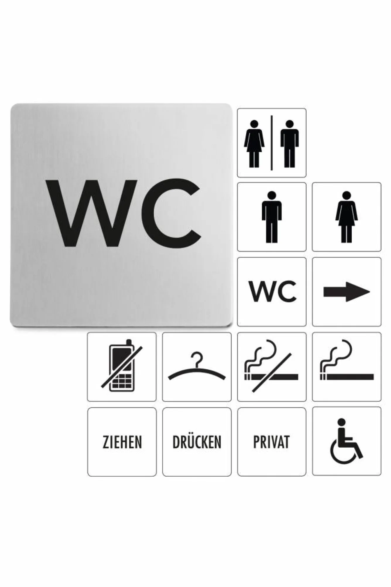 Product informationAdhesive icon WCArticle no. 50715DimensionsWidth: 8 cmLength: 8 cmMaterial informationBrushed stainless steel (mat)ConfirmationSelf-adhesive back (make sure the surface is well degreased before attaching the pictogram)