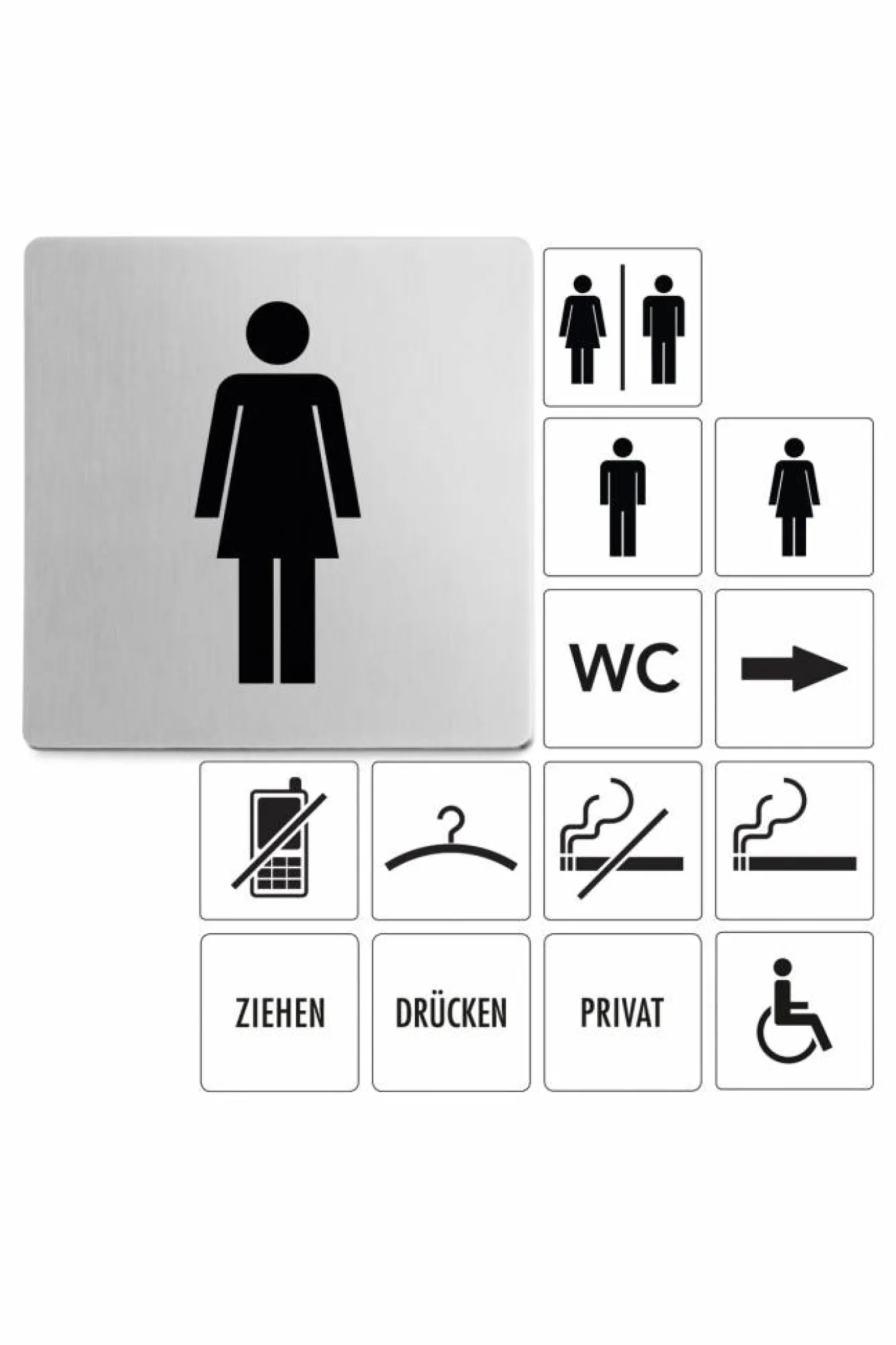 Product informationAdhesive icon womanArticle no. 50714DimensionsWidth: 8 cmLength: 8 cmMaterial informationBrushed stainless steel (mat)ConfirmationSelf-adhesive back (make sure the surface is well degreased before attaching the pictogram)