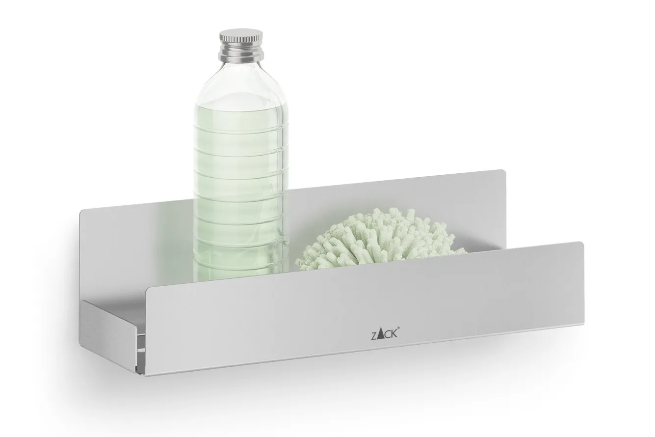 Matt stainless steel wall tray to mount on the wall, so that you have your shower and care products at hand. You can remove the basket from the wall holder for cleaning. You can mount the shower basket on the wall in three ways: screws (included), self-adhesive pads (included) or ZACK Mount (optional, not included).Accessories not included.Product information Shower basket (mat)Article no. 40607DimensionsWidth: 26.5 cmHeight: 7 cmDepth: 9.5 cmMaterial informationMade of matt brushed 18/10 stainless steelCleaningTo clean the ZACK items, we recommend only using water with a little washing-up liquid.