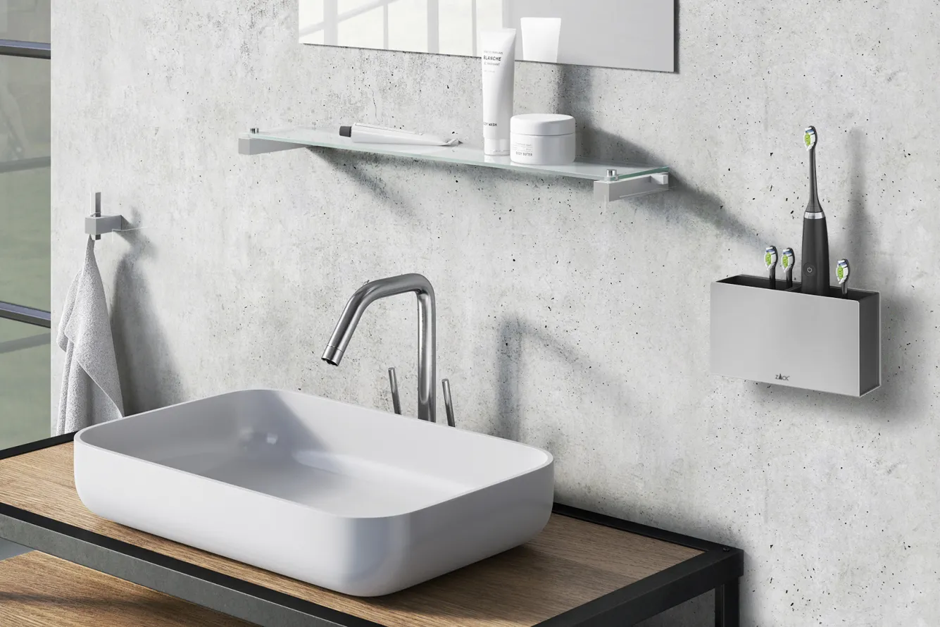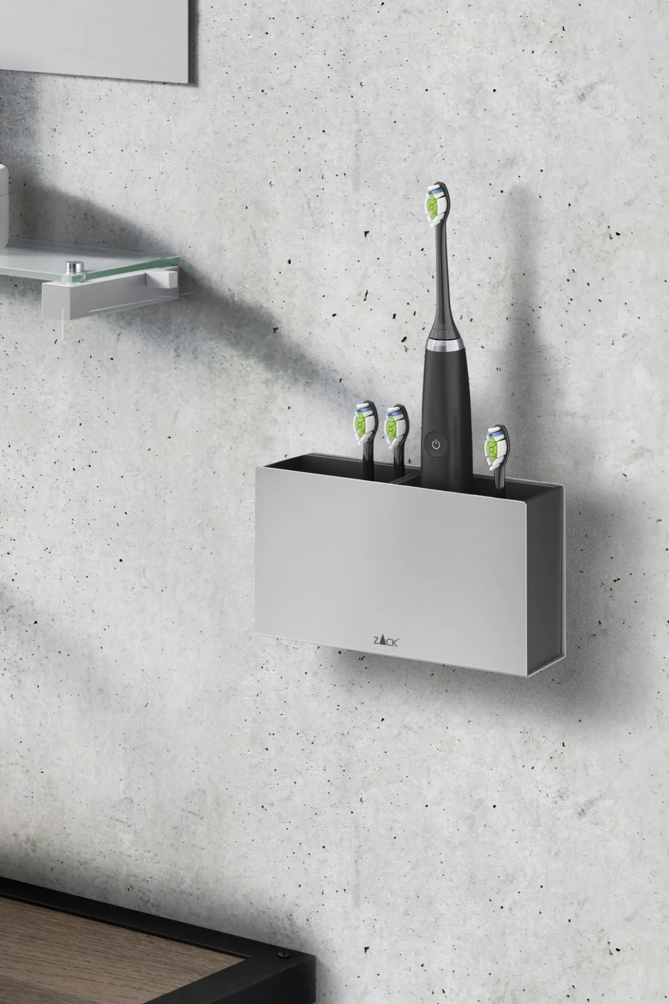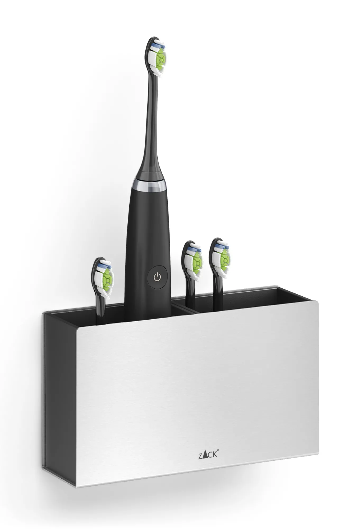 Handy holder to attach to the wall, to use for (electric) toothbrushes or other accessories. For easy cleaning, the toothbrush holder is removable from the wall holder and has two separate plastic inner trays. Maximum size for electric toothbrush handpiece is 34 x 38 mm.Three options for wall mounting: screws (included), adhesive pads (included) or ZACK Mount (optional and not included).Toothbrushes not included.Product information Toothbrush holder (mat)Article no. 40605DimensionsWidth: 16.5 cmHeight: 9.6cmDepth: 6 cmMaterial informationMade of matte brushed 18/10 stainless steelCleaningWe recommend only using water with a little washing-up liquid to clean the ZACK articles.