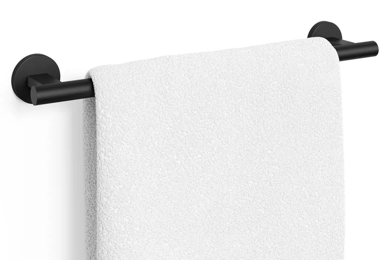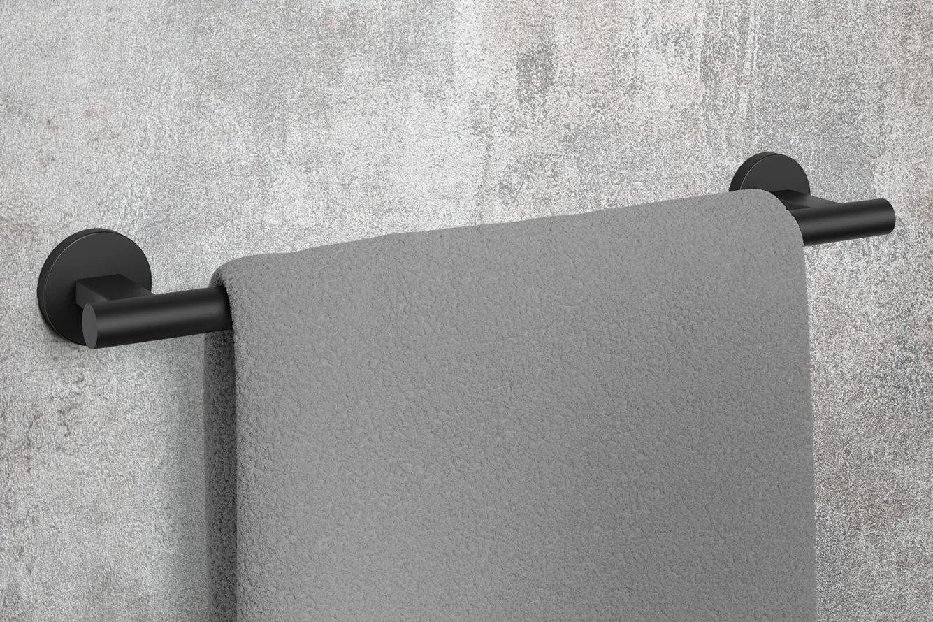 The Scala series from Zack is finished with flowing, round shapes. The black coating provides a tough look. Made of high quality stainless steel. This towel rail is suitable for wall mounting.Product informationTowel barArticle no. 40853Colour blackDimensionsWidth: 51 cmHeight: 6 cmDepth: 8.1 cmMounting points: 2 (Ø 6cm)Material informationBrushed stainless steel with black coatingConfirmationScrews (included)Adhesives (also order the adhesive item no. 30003)CleaningWe recommend only using water with a little washing-up liquid to clean the Zack items.